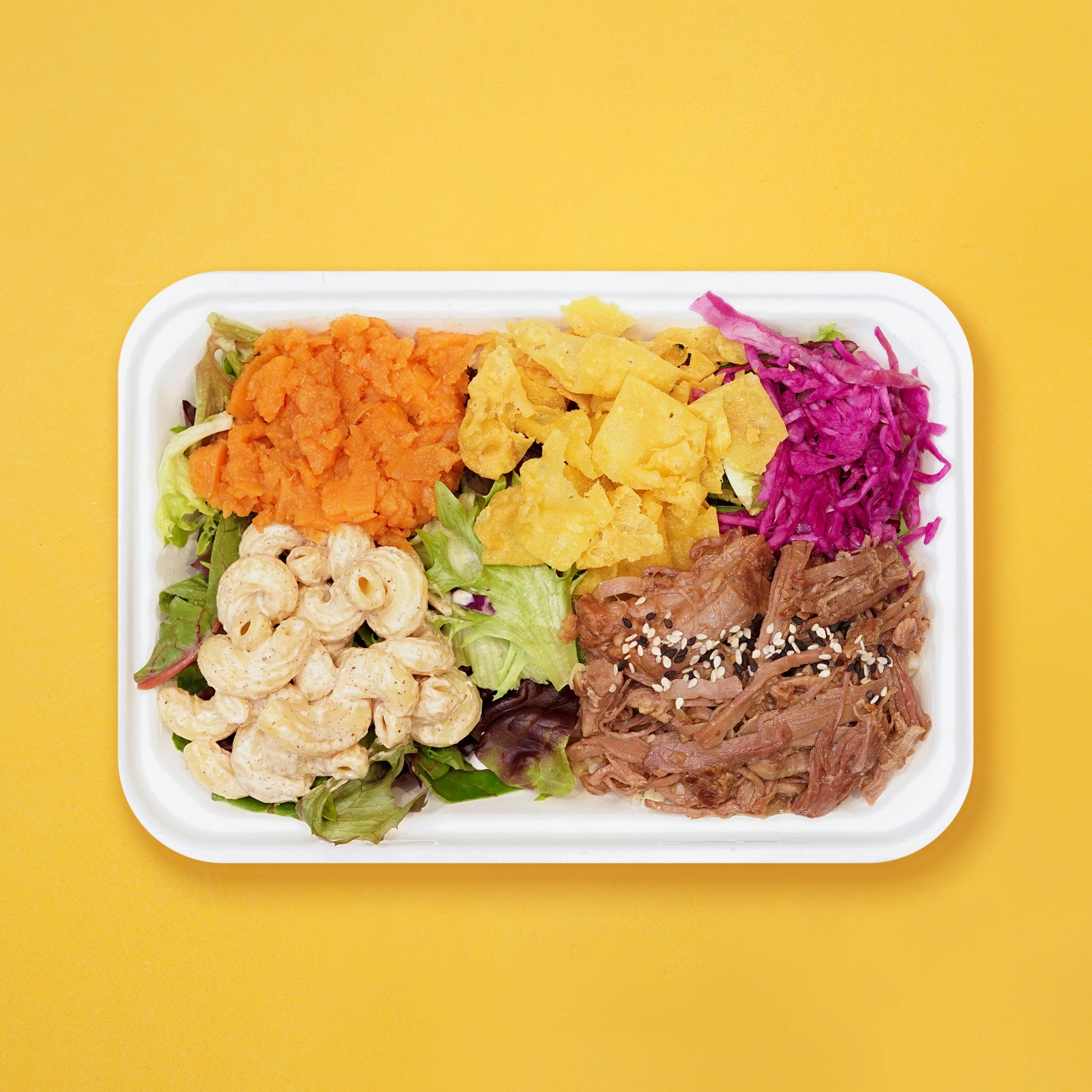 A slow cooked beef cooked through terriyaki style sauce, served with mac salad and sweet potato smash, pickled cabbage, a sprinkle of sesame seeds and wonton chips upon black and white sushi rice.