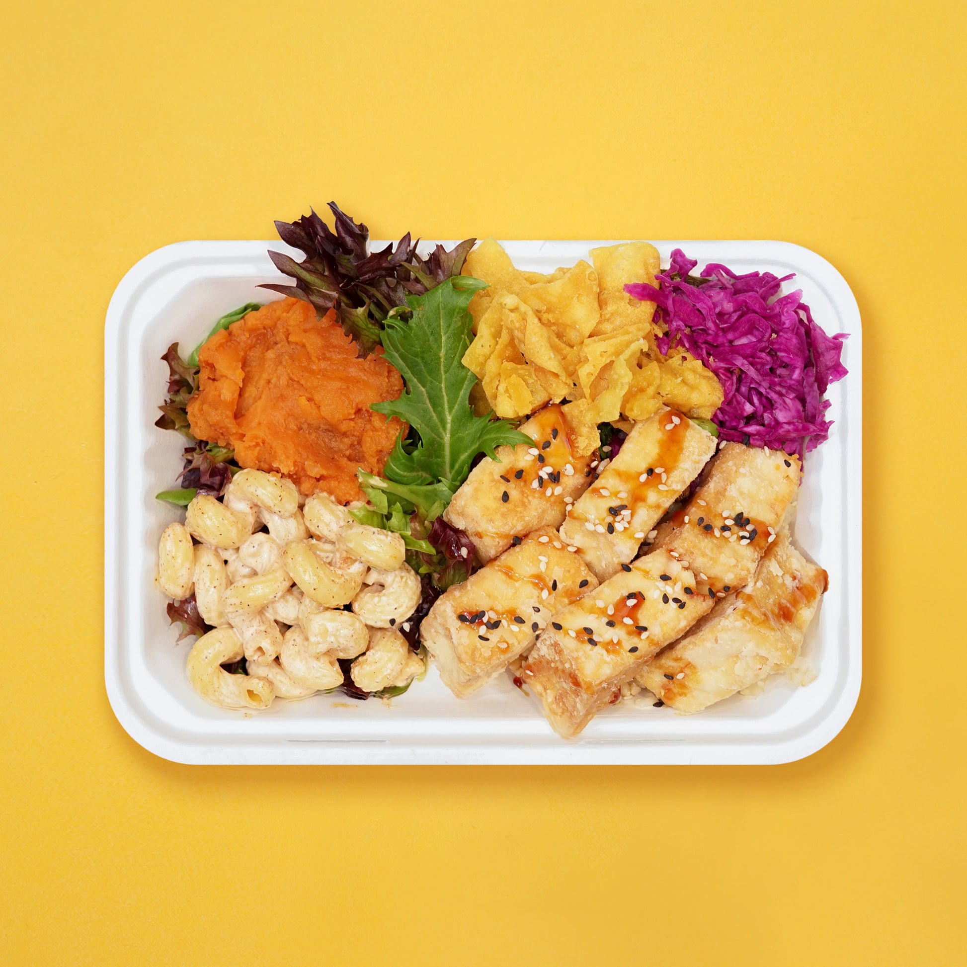 Soft silken tofu fried in a light tempura and dipped in a sticky soy glaze, served with mac salad and sweet potato smash, pickled cabbage, a sprinkle of sesame seeds and wonton chips upon delicious black and white sushi rice.